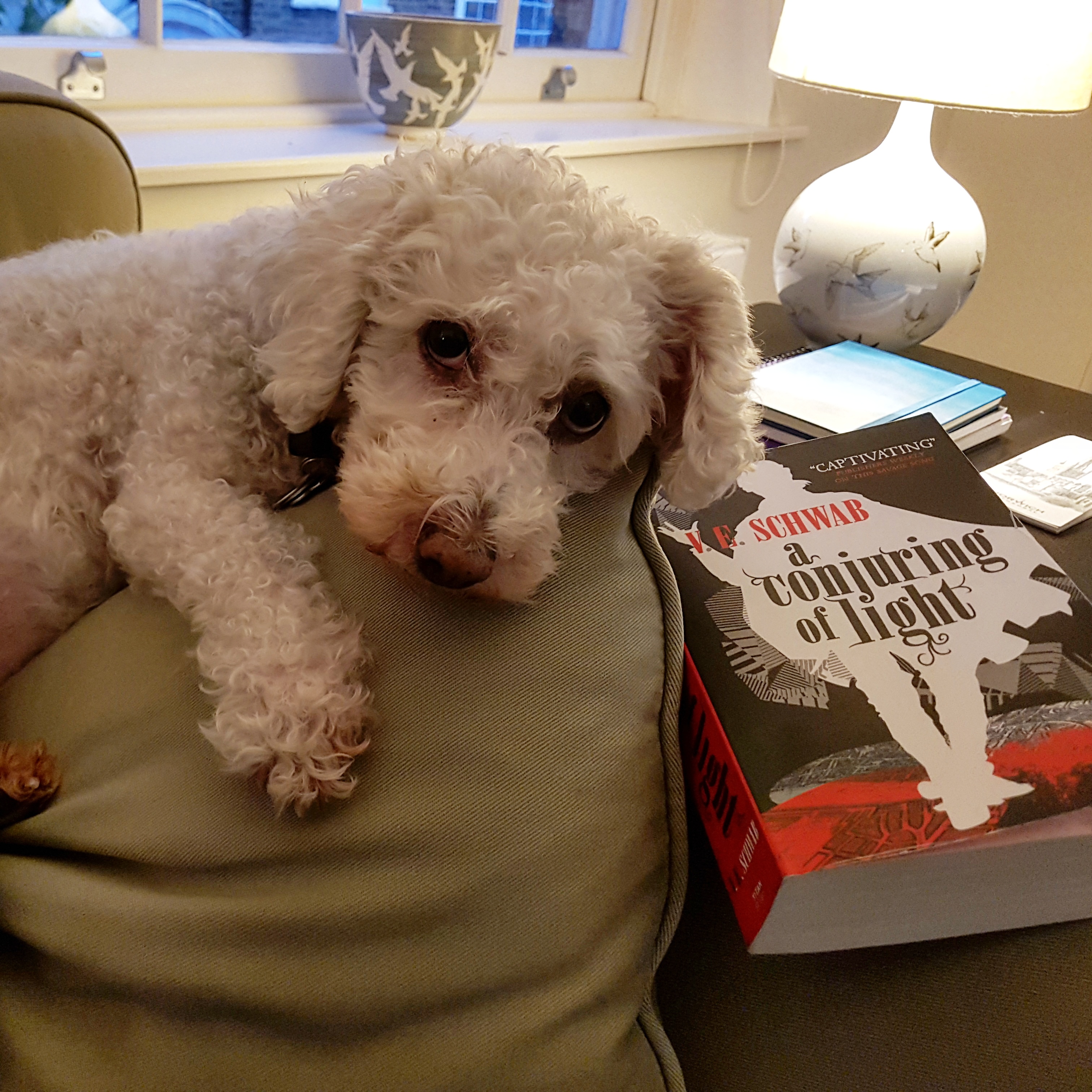 I temporarily traded the cats for dogs when I went to stay with my family in London. Nora was feeling the tension in A Conjuring of Light.